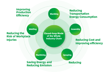 The entire industrial chain is in a closed-loop mode, using digitalization to realize technological processes such as automatic blanking, welding, machining, spraying, final assembly, etc., reducing costs, improving quality and efficiency, and promoting green and low-carbon transformation.