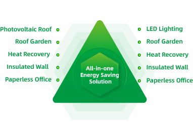 The integrated energy-saving solution is adopted, covering photovoltaic roof, large natural lighting, large vegetation cover in office area, roof garden, heat recovery, rainwater recovery, insulated wall, LED lighting, sensor faucet, paperless office, etc., to create a green zone in all aspects.