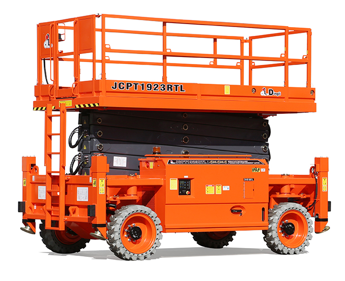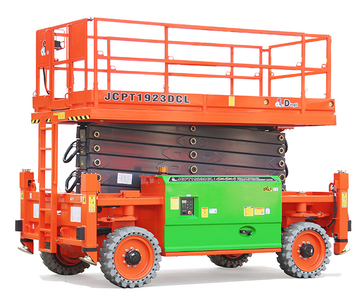 Following the rough-terrain scissors of 22, 28 and 32 meters that feature large load and platform basket, recently Dingli launched the large rough-terrain scissors below 20 meters, which are JCPT1923DCL and JCPT1923RTL, electric and diesel models with the same platform base, offering maximum load of 680kg.